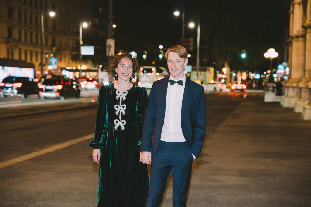 You don’t need to match — you need to complement. A burgundy coat beside a camel coat reads as beautifully coordinated without looking costume-like. Avoid one person in dark and one in light unless you’re shooting Schönbrunn’s bright exterior, where the contrast can work in your favour.